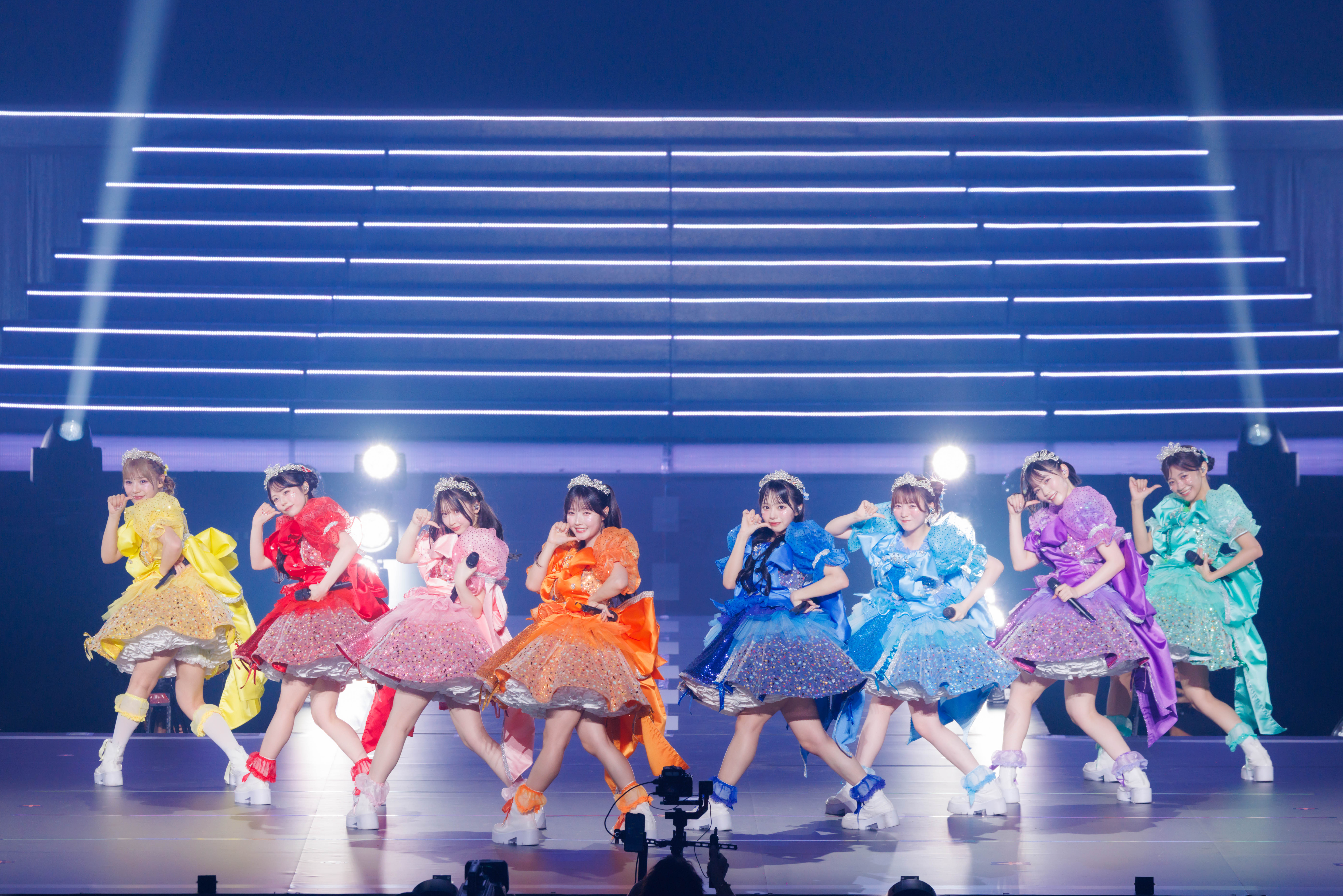 その声に力をもらった8人は新衣装に変身して再度ステージに登場。ありぼぼ(ヤバイTシャツ屋さん)が作詞作曲を手がけたポップチューン「ちきゅーめいくあっぷ計画」、「かわだめ」の続編として話題の「かわいいさがしてくれますか?」、2ndシングルCD表題曲「キューにストップできません!」を披露。疾走感あふれる楽曲たちとメンバーたちのパワフルかつ変幻自在なパフォーマンスで、会場の盛り上がりを最高潮へと押し上げる。さらに、「ハルフレーク」で爽やかな歌声を届けると、本ツアーで解禁されたグループ初のバラード曲「多元幸福論」でファンの心を掴んだ。