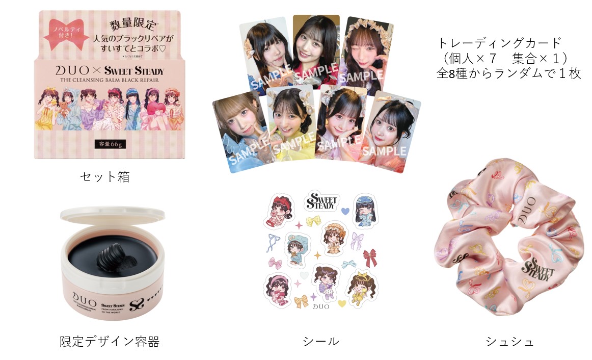 ベストコスメを多数受賞するDUOの⼈気商品「ザ クレンジングバーム ブラックリペア」とSWEET STEADYによるコラボ商品は、イラストレーターasukaがメンバーを描き下ろしたイラストが配された外箱デザイン。オリジナルデザインのシュシュ、シール、トレーディングカードがセットになった限定商品となります。