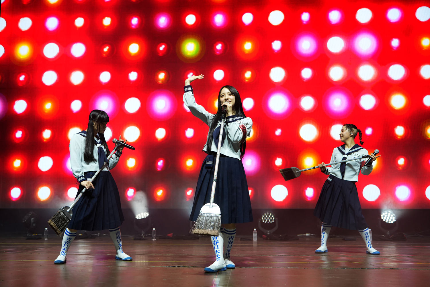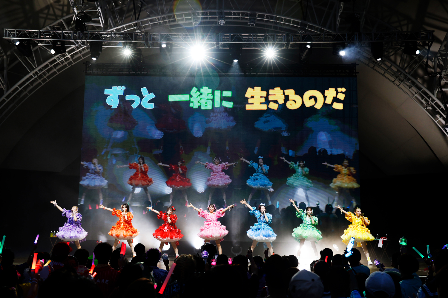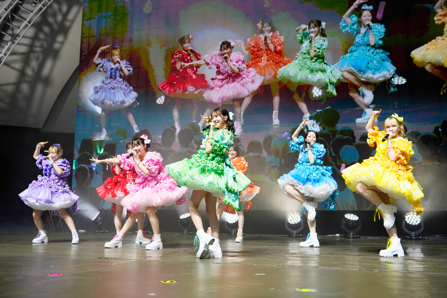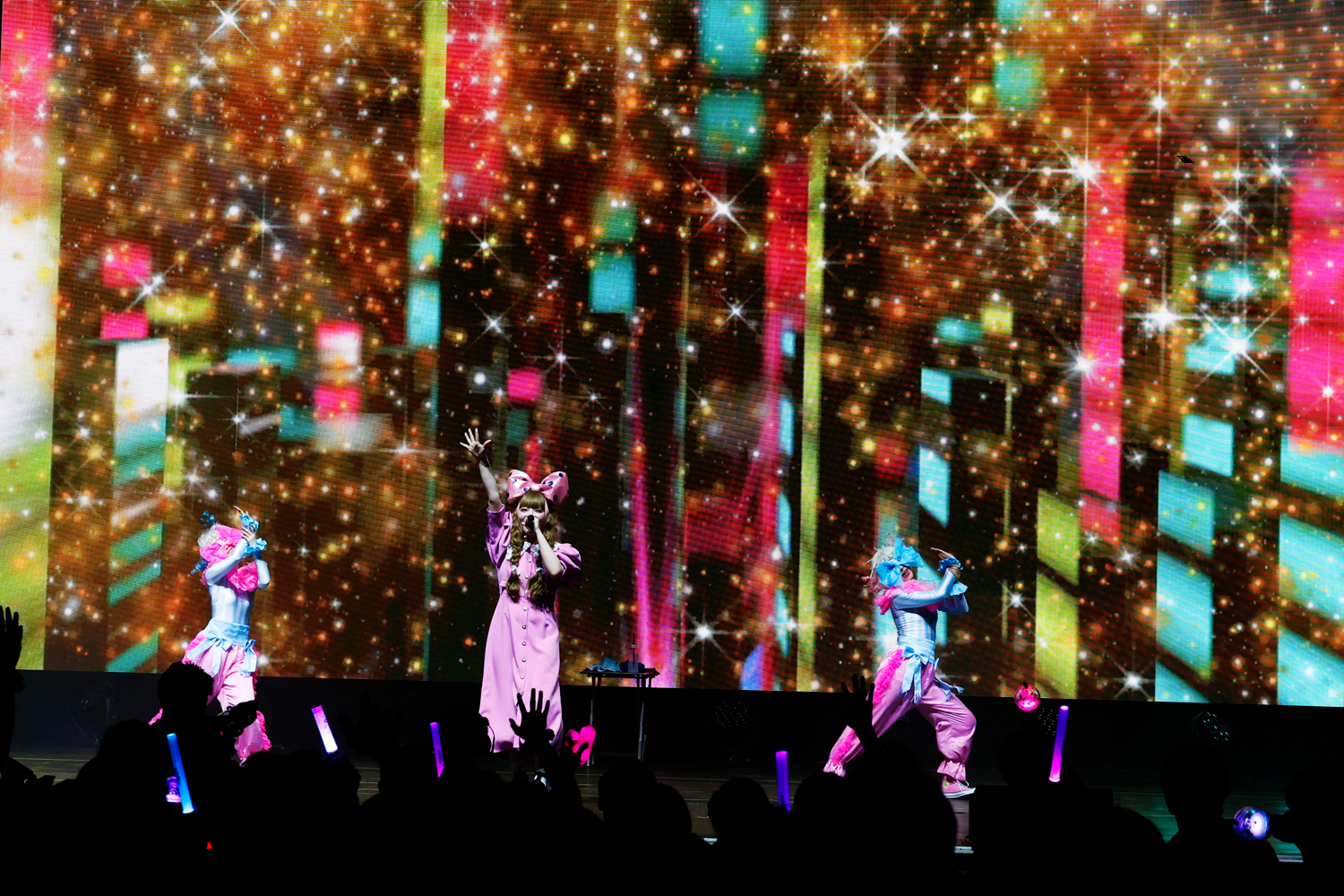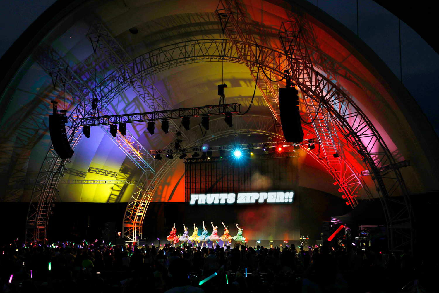 最初にステージに登場したのは、“NEW KAWAII”を発信し、昨年は初のアジアツアーを成功、今年2月には東京ドームを満員の観客で埋め尽くしたFRUITS ZIPPER。「Hello!FRUITS ZIPPERです。Let’s KAWAII Dance!」と、櫻井優衣の掛け声とともに代表曲「わたしの一番かわいいところ」をパフォーマンス。さらに「ぴゅあいんざわーるど」を披露し、開演早々、客席をヒートアップさせる。MCではメンバー全員が英語での自己紹介に挑戦。ライブ後半戦では「NEW KAWAII」では、松本かれんのセリフパートで“NEW KAWAII”ではなく、“NEW HAWAII”と言うアレンジを見せたりと、ここでしか見れないパフォーマンスでさらに会場を盛り上げた。そのまま「はちゃめちゃわちゃライフ!」「完璧主義で☆」をポップかつキュートに披露し、ラストには「ふるっぱーりー!」で会場のテンションをMAXに引き上げ、ステージを後にした。